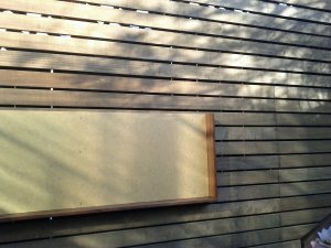 These panels are basically 20″x20″, and 2 1/2″ deep. Tony and I cut plywood to fit a trio, snugly fitted side-by-side. We hung the plywood on the Ipé wood fence over the fountain, fixing it securely to the posts. We got Ipé wood to frame the panels, and sealed it with a wax and preservative to match the fence. It’ll all age together, since the fence is relatively new as well. We attached the side pieces and then the bottom piece directly to the plywood frame and to each other, to make a sort of nest into which we could set the panels. We fitted in the panels one by one, securing with screws, and capped off the frame with the top piece of Ipé. It looks like it’s part of the fence! Love it.