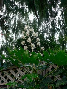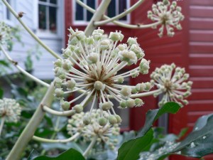 The inflorescence (presentation of flowering parts – what many might simply misname a “flower”) on this Fatsia japonica is one big ol’ girl. Bigger than my head, wearing a fez. (Yes, I made sure.) Fatsias get to be 10-12 feet tall and 6 feet wide, with leaves bigger than dinner plates. They’ll sprout multiple trunks, and seed readily. They readily cross with Hedera helix, your classic invasive ivy, to make X Fatshedera lizeii, which is a lovely desirable garden ornamental that has the lovely clambering effects of ivy, but more trunklike from the Fatsia, and isn’t a nightmare to everything around it.