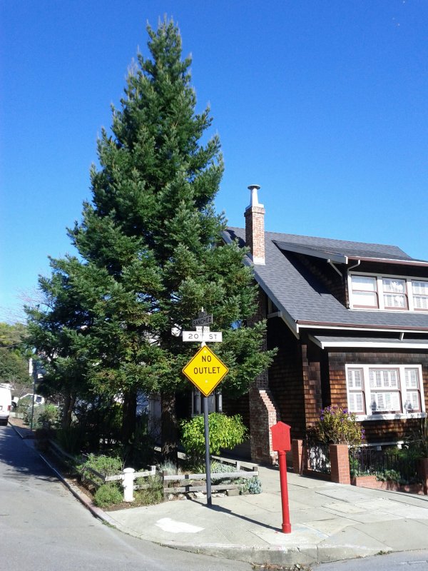 Nice little sidewalk garden with a redwood! Love the little split-rail fence.