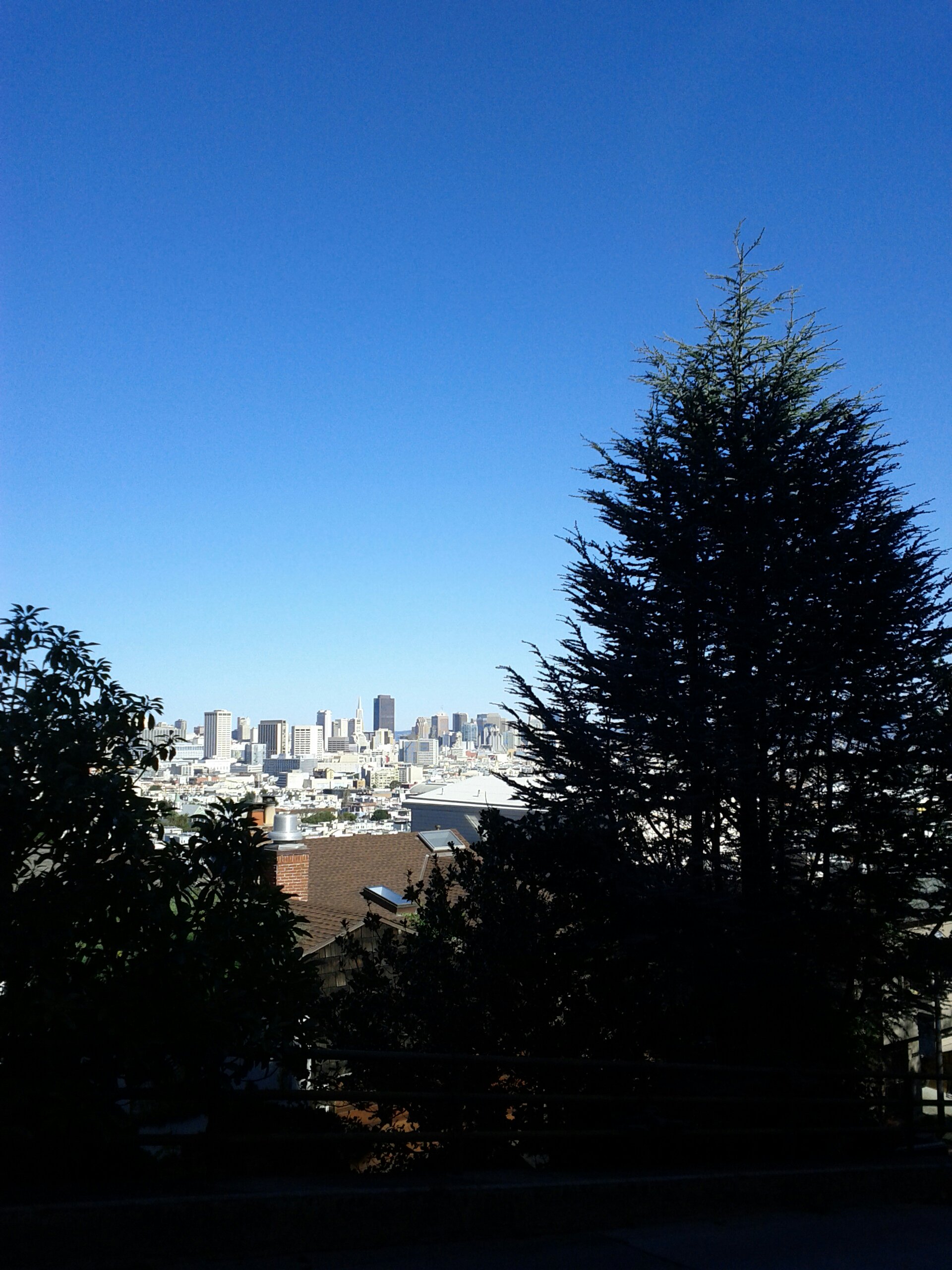 View from midway along the upper terrace of Liberty, facing northeast towards downtown.