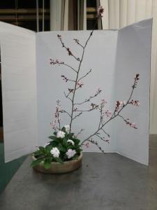 Lesson 3: Moribana, Basic Upright, Gyakugatte. Flowering plum branches with Impatiens.