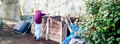 Longtime garden volunteer Dick Miner, “The Worm Man of Alcatraz”, tending his blue ribbon composting operations