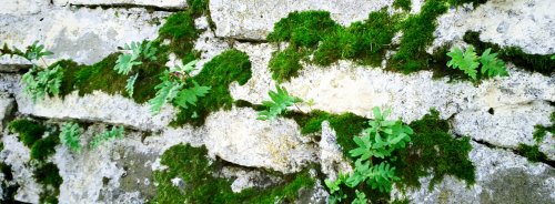 Stone wall of ferns and succulents, along the Main Road on Alcatraz