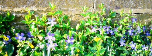 Vivid shot of purple and white around the sunny birdbath in the Prisoners’ Garden