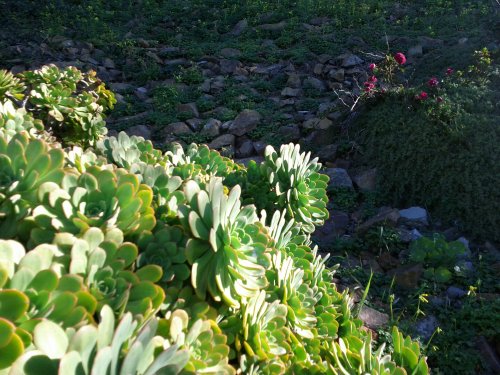 The slopes are well-suited to many succulent plants, and drought-tolerant plants from Mediterranean Climate zones around the world. Geraniums (Pelargonium species) tolerate the same conditions as so many of the succulent plants that thrive on the island. The West Lawn slopes are replete with many species of Aeonium, Agave, Echeveria, Cotyledon, Crassula, and members of Mesembryanthemaceae (the Ice Plants family), and have been growing in for a couple of years. A Pelargonium was already doing well on the slope, so this last patch of grass needed to be pulled and replaced with some cuttings that had been rooted from geraniums on other parts of the island. The gardens’ staff gardener, Shelagh, chose Pelargonium ‘Prince Bismarck’ for its magenta flowers that will nicely highlight the umber tones of the spines on the Agave below. (I think it’s Agave parryi truncata, but I’m not 100% on that.)