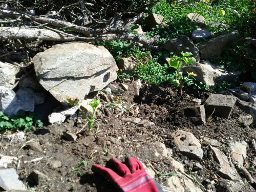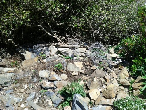 It was some tricky footing and took a bit of clever stacking of rubble to retain parts of the slope. One benefit of weeding on a steep slope is that you don’t have to bend over so far! Still, my legs got quite a workout from maintaining balance in the loose rubble. Plus, it took many trips up and down: had to empty my 5-gallon bucket many times into a larger tub, had to water everything in by bucket (the hose was in use elsewhere), and had to put chicken wire cages over each of the plants afterwards. I’ll explain.