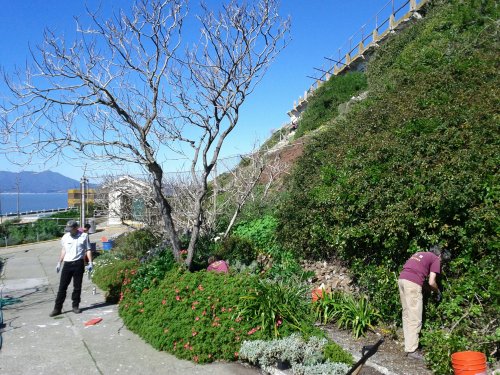 I was given a fun task this week that turned out to be somewhat challenging, yet very rewarding. I weeded some overgrown wild grasses off of a slope, and planted the slope with some geraniums. Doesn’t seem too difficult, but the site conditions added to the challenge. I suppose weeding really shouldn’t be so much fun, but when you’re doing it someplace like Alcatraz there really is nothing to complain about. I mean, sitting there in the sun, looking out over the bay and the SF skyline and the Golden Gate Bridge… Heaven!