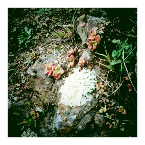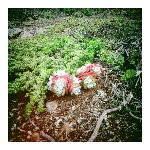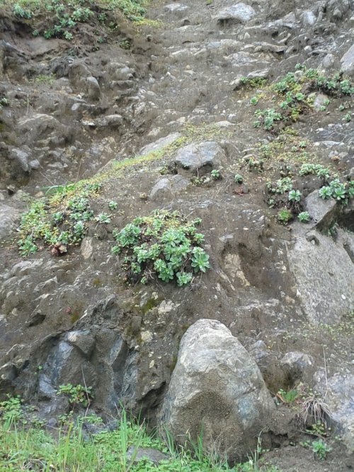Succulents and lichens coexist on the rock face, living on water from summer fog and winter rain.