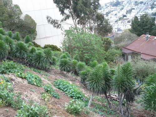 Week two’s hikes started at Coit Tower, and I know for sure I will be doing a future post on the staircases over here. There are plenty of offerings out there already on the Telegraph Hill staircases, especially after Tales of the City. I’ll add my bit anyway. 🙂 On my way to meet the class, I got up the hill from Embarcadero via the Greenwich Street stairs. Beautiful views and gardens abound… The steep sides of the hill were created when mid-nineteenth century San Franciscans blasted the hill apart to use the rocks as ships’ ballast. Now it’s prime real estate. 🙂 Every bit of open space is either a private garden/yard or is common space that the neighbors maintain with equal attention to their own gardens. Quite a treat!