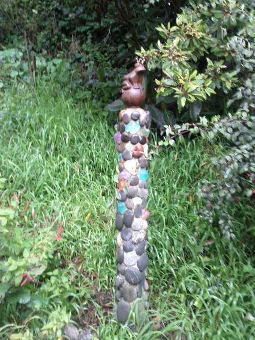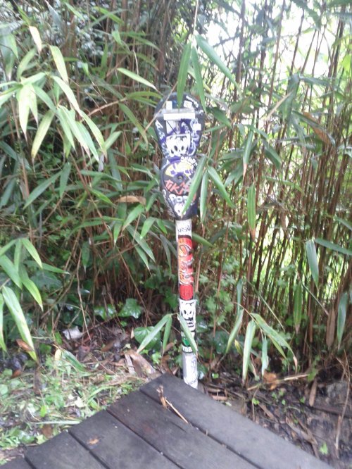 No pix to show from here, since the only section of natural stone still visible is covered by chain-link fencing, in preparation for a spray-on coating of concrete. A construction crew was working right there to repair Muni streetcar tracks, though, and I scored an awesome old rusty twisted railroad tie to incorporate into our garden art at home.