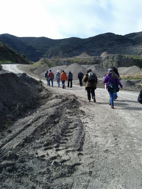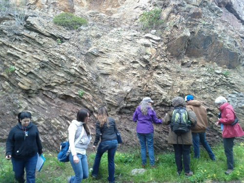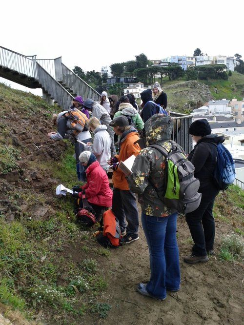 The motivation was school. I took a class at CCSF called Geology of San Francisco. We have a unique geology in the world, and it’s pretty nifty to go out on a field class with an expert in the subject (Katryn Wiese, if any of y’all plan to attend in the future.) Over the past two weekends, our class has met at different sites and carpooled from spot to spot, with a good 7 hours of the day being spent hiking, digging, talking, sketching, identifying. SF has five distinct slices of terrane (a geologically specific region or component of the land), added over millions of years by the tectonic movement that created the San Andreas Fault at our feet. Each of the five diagonal slices of SF was basically scraped off of one plate onto the edge of the other, kinda like if you take apart an Oreo and bulldoze the goo with the other half – you get a broken pileup of goo. Keep going: bulldoze another flavor Oreo, and you get another stripe of goo. SF is five stripes of goo.