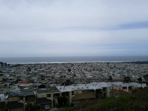 This is waaaayyyyyy out there, the very top left corner of the City. In the woods above the Cliff House and the ruins of the Sutro Baths. Nice wide flat paved road that used to have a steam locomotive to bring 19th century San Franciscans out to the baths. Massive landslides annually eventually made the tracks all go away and the builders give up on the effort of maintaining them. Plus, cars came along, so the beach was no longer a couple hours’ journey across the dunes from San Francisco. We could see clearly where landslides had changed the lay of the land. Most excellent.