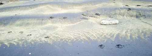 We ended our second field day walking the beach southward from the zoo. Tide cut us off at a promontory, so we backtracked and relocated further south at Fort Funston to approach from the other direction. We saw some cool stuff: massive erosion collapsing the dunes that the parking lots are built on, and the associated rubble of collapsed parking lots (go geology). We saw a massive mudstone-based cliff of dunes with evidence of a volcanic eruption 400,000 years ago (the Rockland Ash layer, if you’re interested). We saw fossils by the thousands – clams and sand dollars, from a million years ago and more. Just amazing. And magnetic sand. The sands here contain lots of magnetite, which separates from the rest in the blowing wind, making cool patterns and creating black sand patches among the beige. And it sticks to magnets. And it’s sparkly. Good stuff.