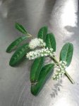 Manipulating Plant Materials| I mentioned that, basically, no material goes into an arrangement unaltered. A branch of English laurel covered in leaves and flower spikes, for example, is lovely. It’s difficult to fit into an arrangement, though. You want to snip off leaves and flowers and side branches to bring the focus where you want it, to make it less of a natural branch and more of an artistic presentation of the plant.