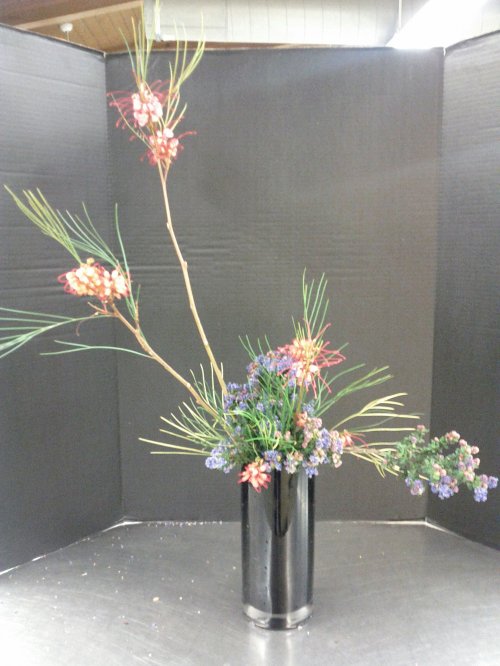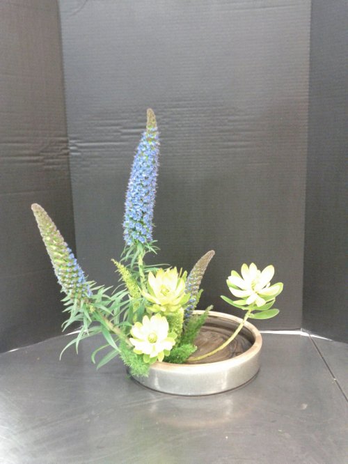 Midterm arrangement number 1: Basic upright Moribana, with Echium (Pride of Madeira) and Leucadendron ‘Safari Goldstrike’.