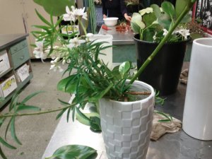 This last pic was the teacher’s own creation that is from a way-future lesson. She was demonstrating horizontal arrangements for the level four students (I’m still level one). I was just so damn moved by it that I had to throw this in, too. She had visited a Frank Lloyd Wright house – Falling Water, I believe – and was inspired to create this arrangement. Using bamboo and Tillandsia xerographica (a very popular one at my work), she did this amazing number.