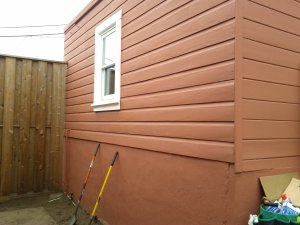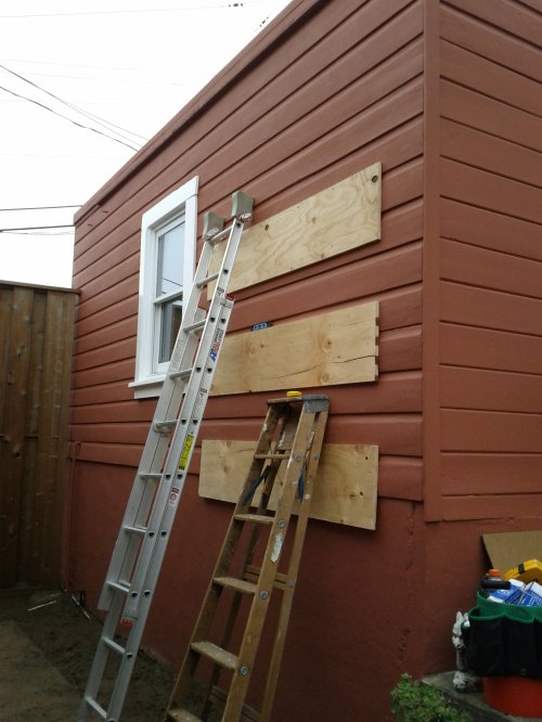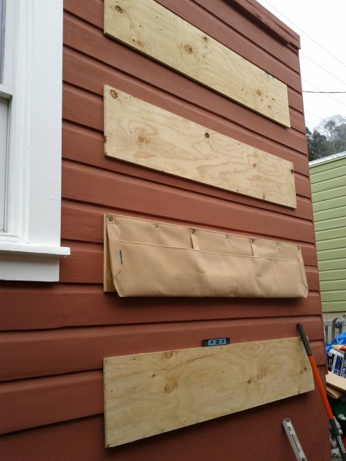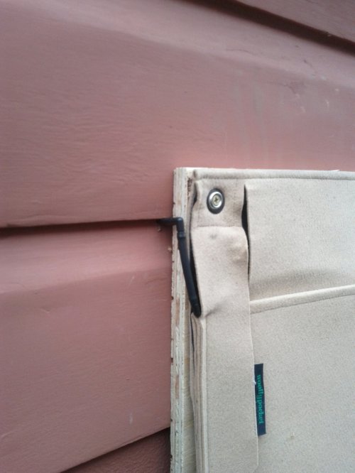 The pockets are 100% plastic (polyester felt) and can be hung directly on interior or exterior walls. Outside with no overhanging eaves, though, we decided to back them with plywood. It’s a foggy neighborhood, and we didn’t want fog-dampened fabric against the paint all day and night. Also, the studs on the walls are 24″ apart, and the pockets have their mountings at 22″ spacing. To make the whole thing sturdier, plywood just made sense here.