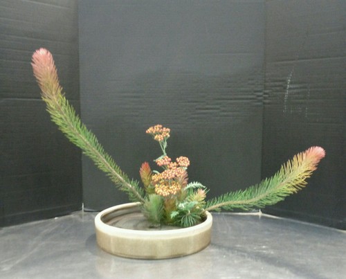 This has gotta be my favorite arrangement so far! Slanting Moribana, Variation #2. Calothamnus villosus (Silky Net Bush) with Achillea ‘Fire Land’.