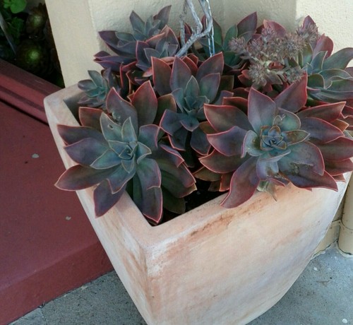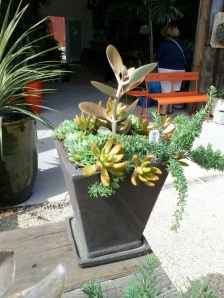 Fun composition I did at Flora Grubb Gardens. The tall thang is Kalanchoe orgyalis (Copper Spoons), there’s Echeveria ramillete, Sedum ‘Coppertone’, and Grevillea ‘Jade Mound’ spilling over.