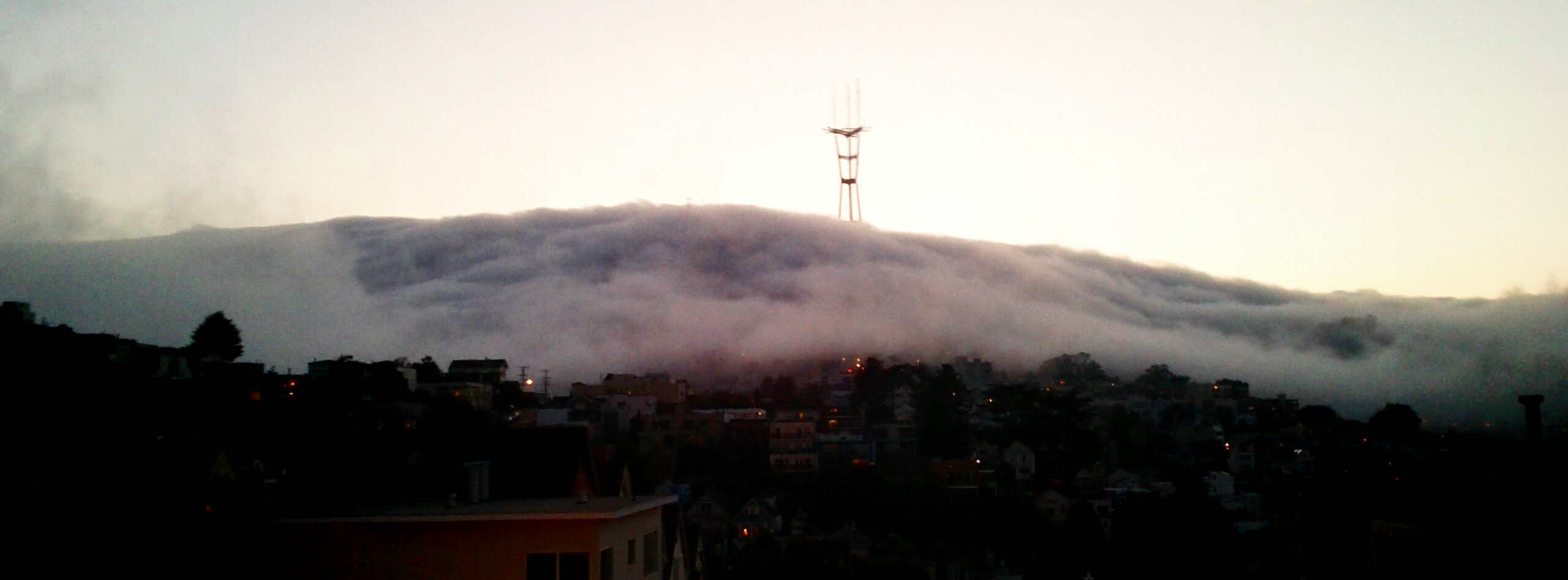 Many times I’ve taken pix of the fog rolling in over our hills. I love how Eureka Valley, where I live in the Castro, is one of the warmer enclaves, and the fog splits around us even as it pours in. Eventually we cool enough that the gap gets smaller and smaller, until we ultimately meet the same foggy fate as our neighboring valleys that don’t benefit from the big fog-block of Twin Peaks.