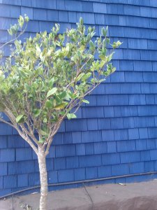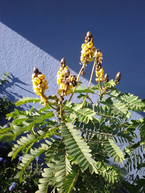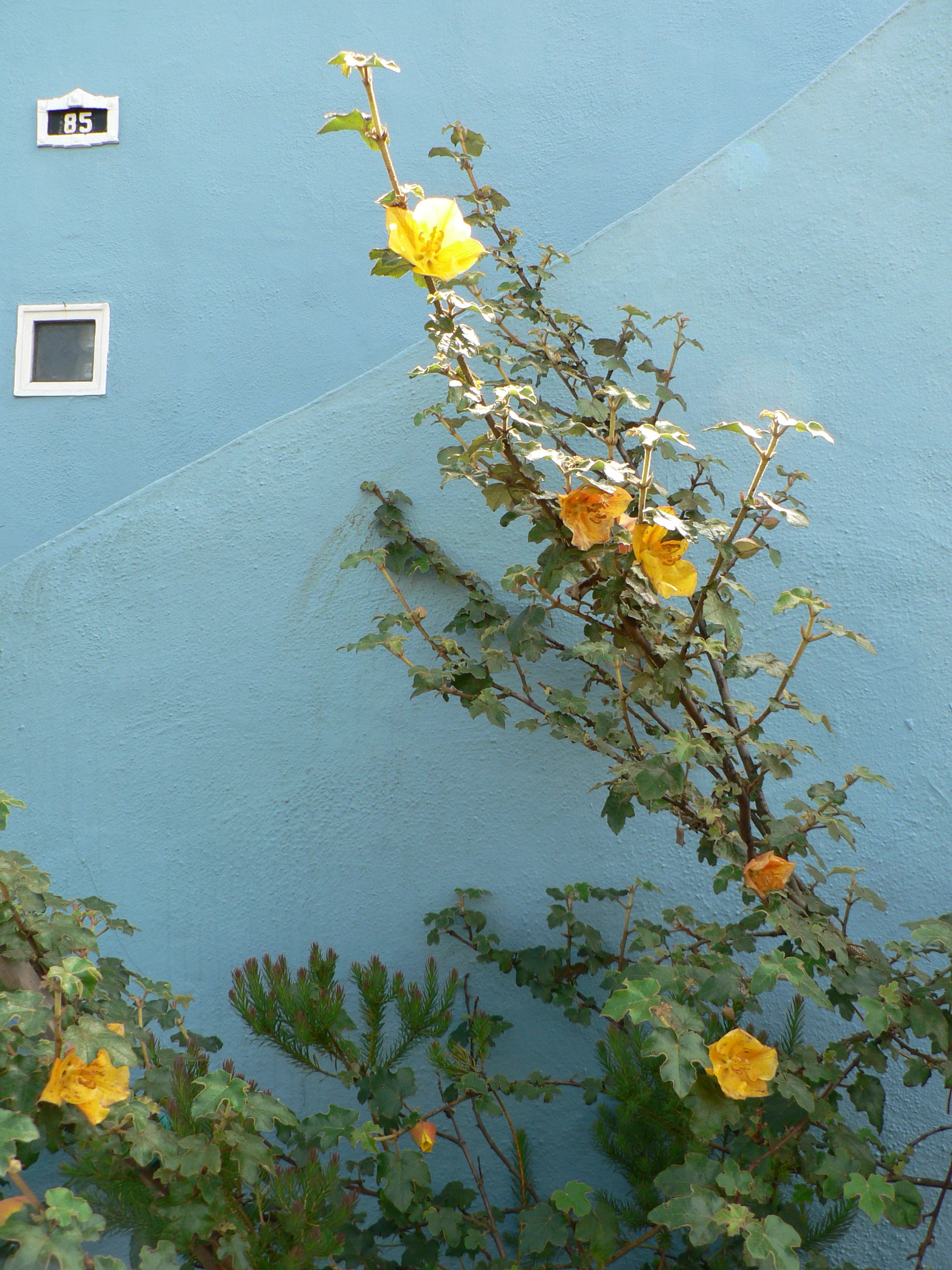 Look how fantastic this CA native Fremontodendron californica (flannel bush) can look in front of a blue wall!