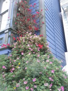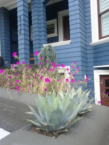 More specifically, it’s cobalt blue and teal that are most moving to me these days. I’ve seen royal blue and sky blue houses throughout my life, but I’m loving this new tendency towards darker, more rich blues that I’ve been seeing. Houses come in very few colors, when it comes down to it. There’s variations on beige, there’s whites and grays, and there’s yellows. That accounts for about 80% of houses, I’d guess. In the early 1990’s we started seeing sagey greens, and that seems to be sticking around – as persistent and as exciting as beige. This one house down the street from me was painted a fantastic blue, with green and mahogany highlights, and I love it! Soon after, I started becoming aware of the color on other houses and in gardens.