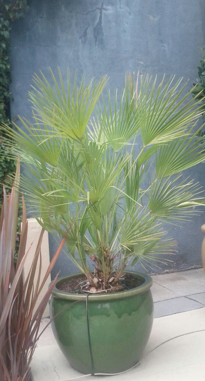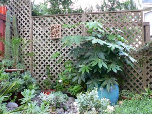 Fatsia japonica in a bottomless blue pot that I sunk into the ground in our garden. Little highlight of blue among the greens.