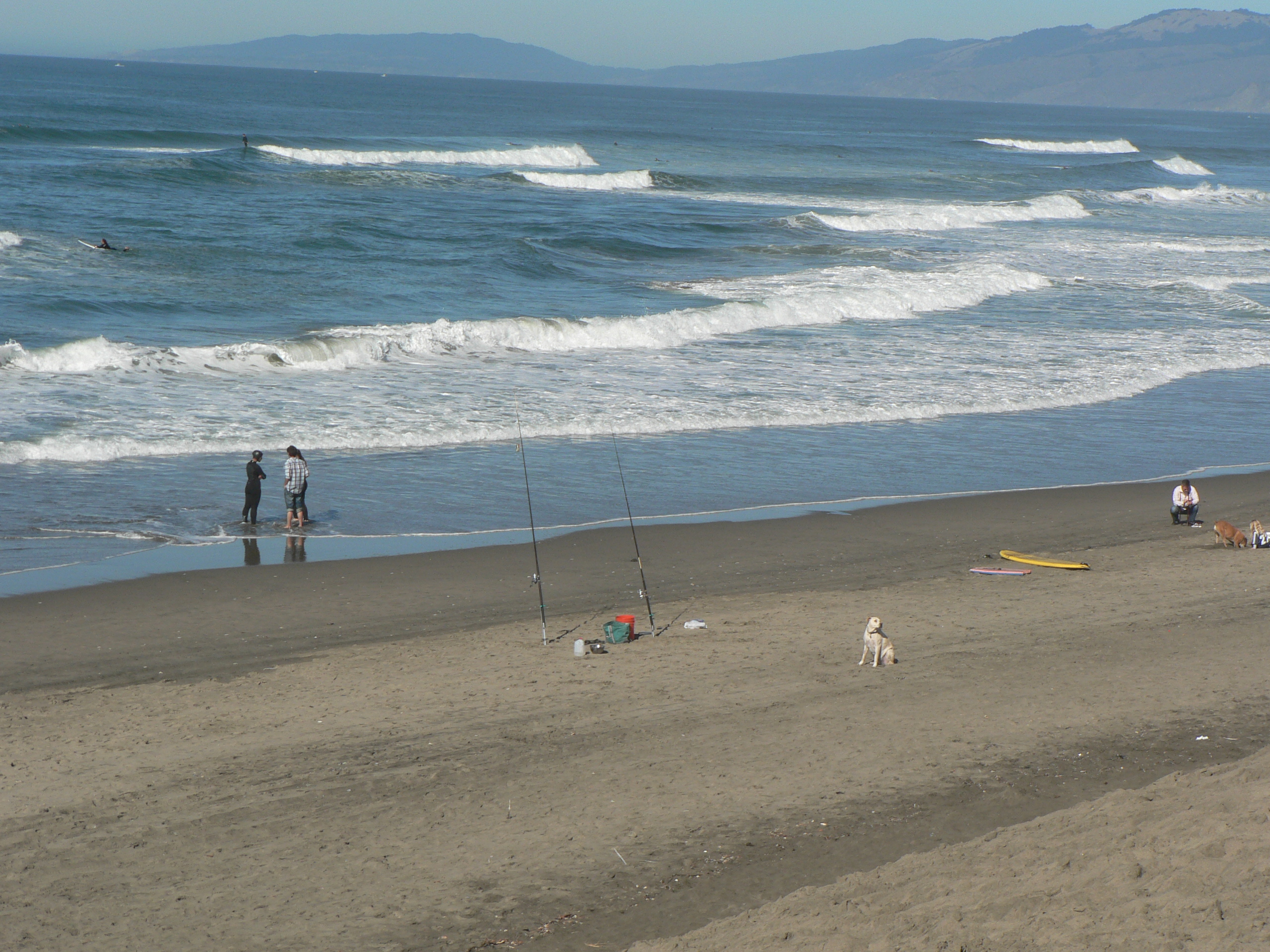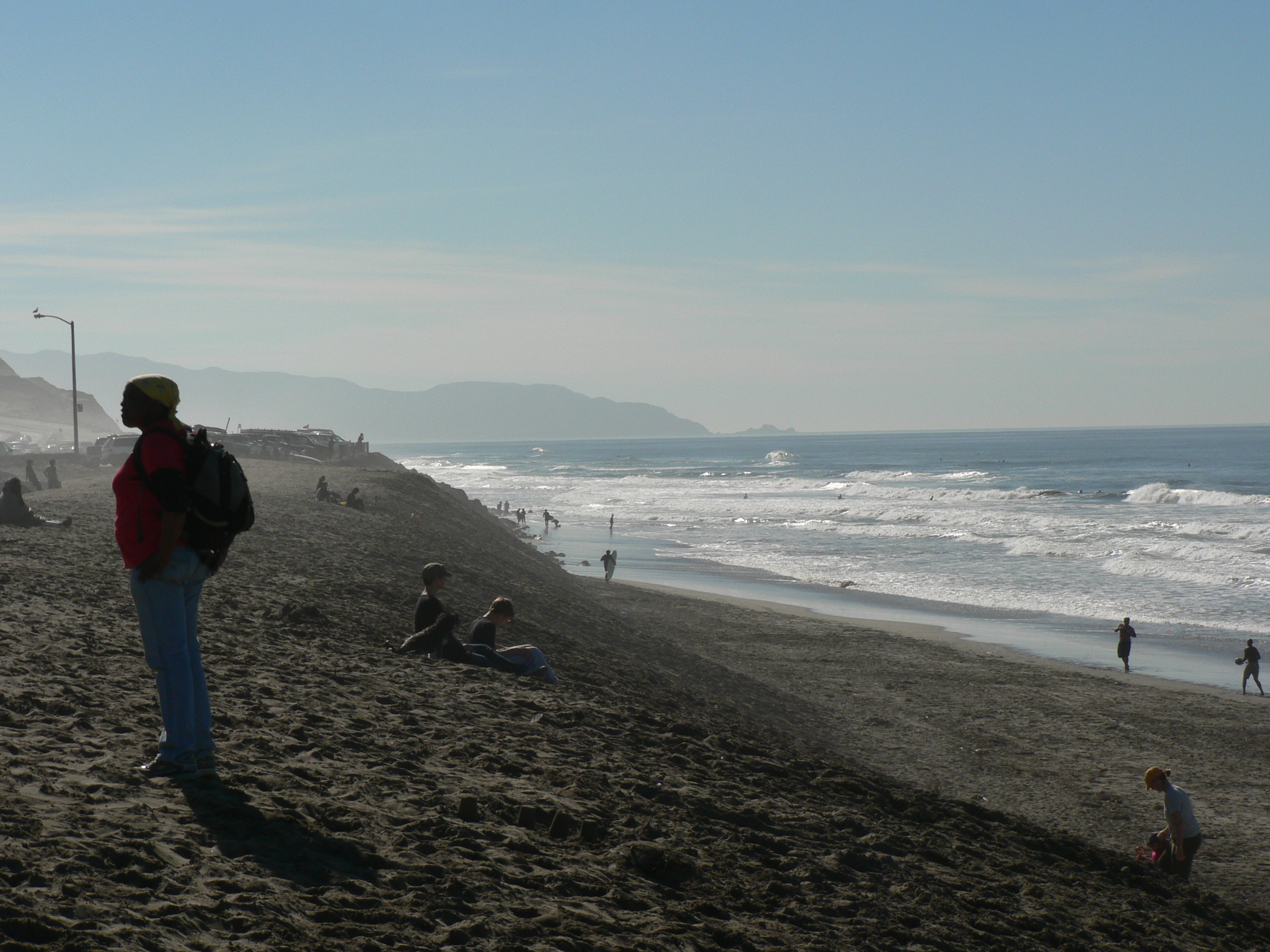The southward view along Pacifica’s beach. Surfers and sleepers show what our California beaches are all about, and why we make the efforts to protect our natural resources.