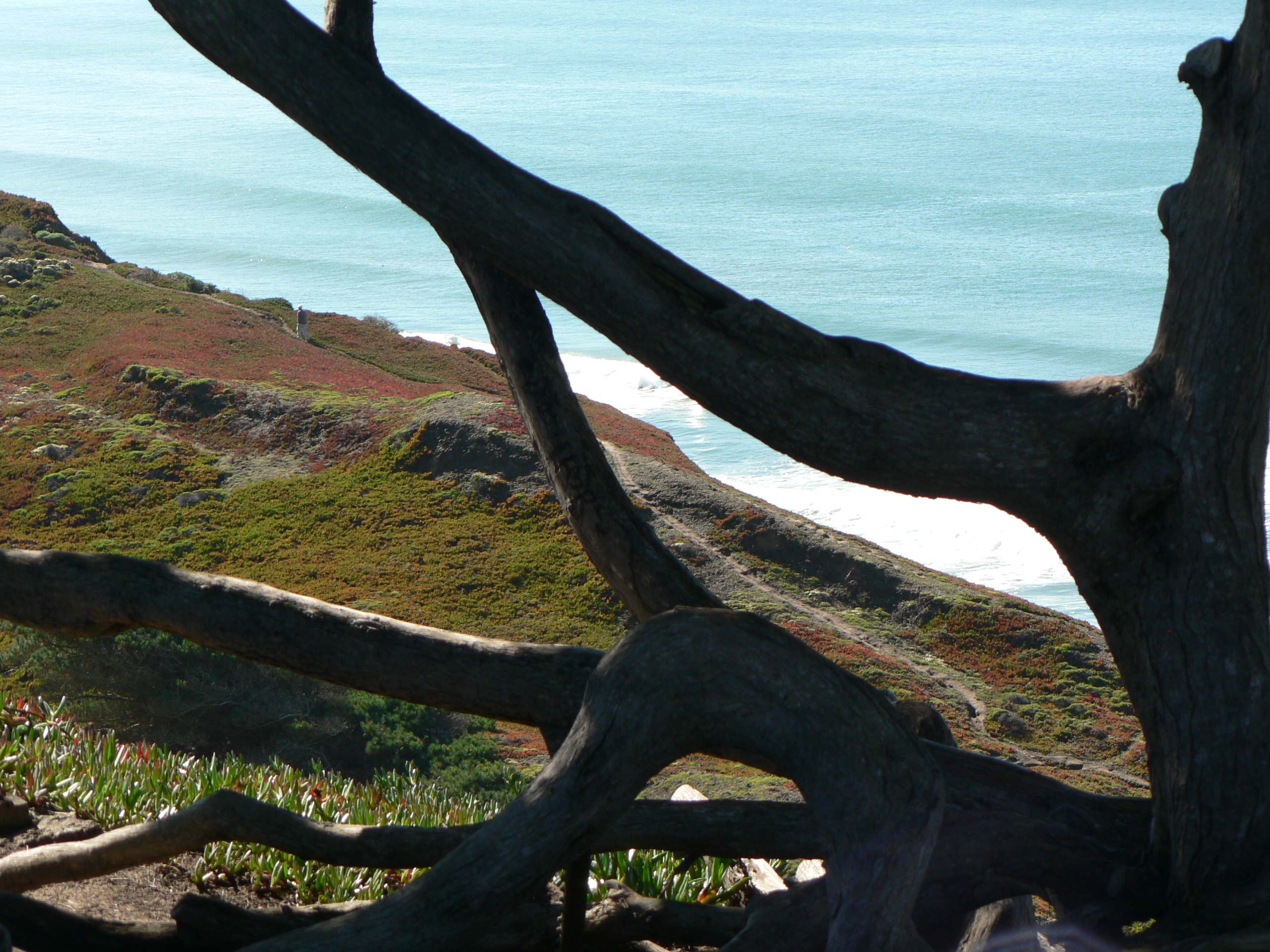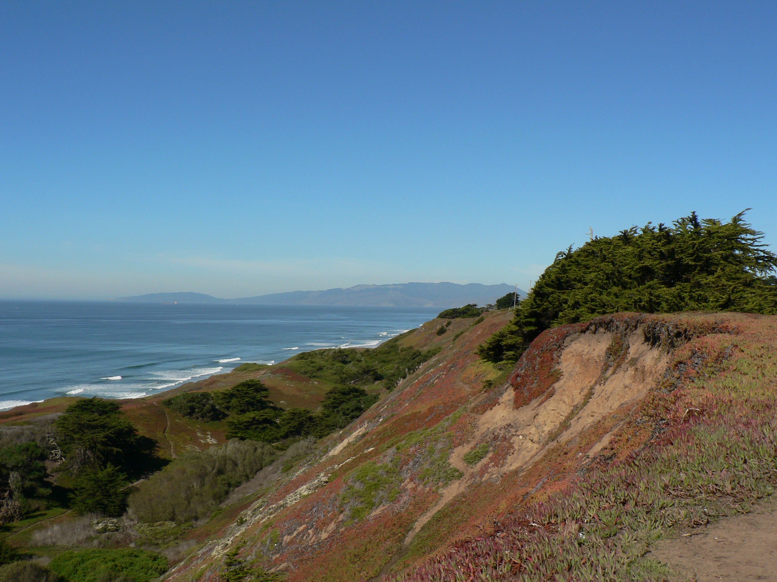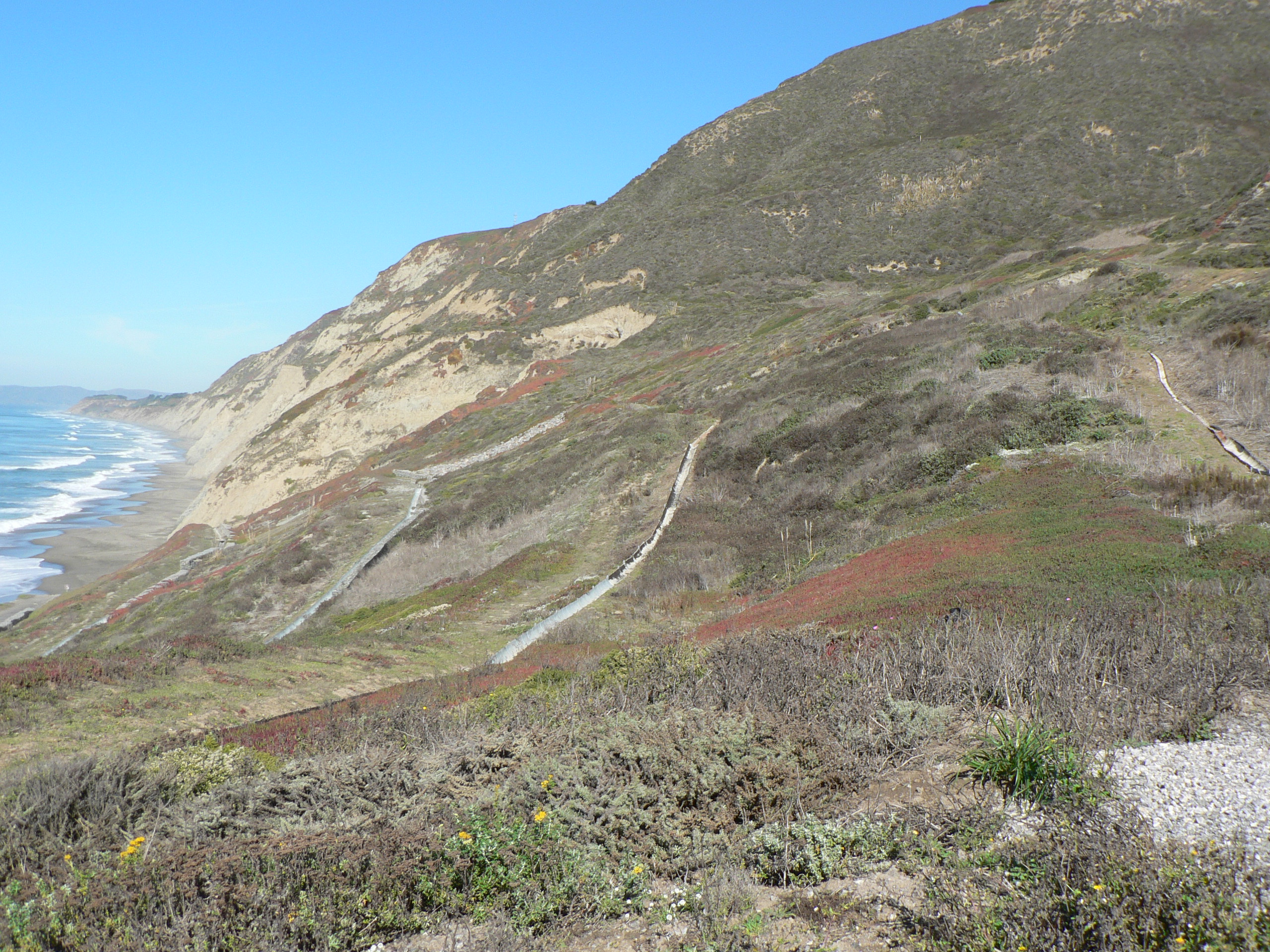 Descending through the landslide zone at Mussel Rock. The gap on the left of the dark hills on the horizon is where the San Andreas comes back ashore. Mt. Tam is on the right of the gap, Point Reyes is the left nub.