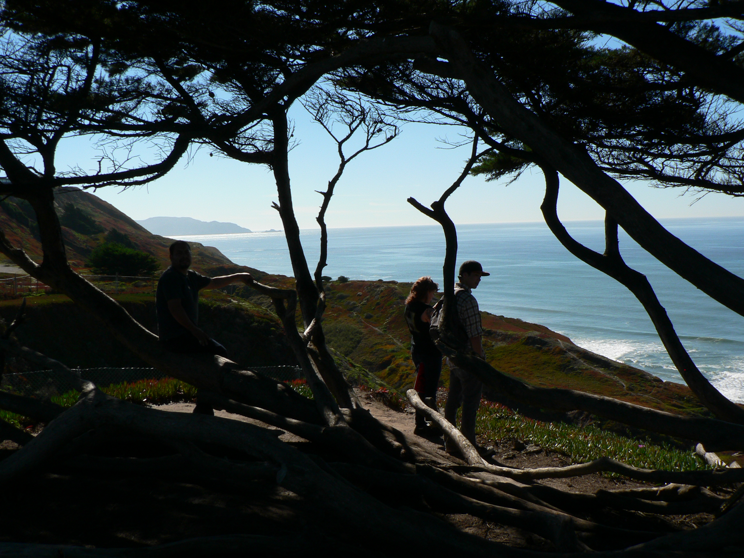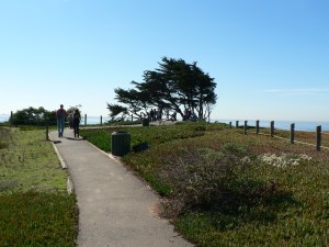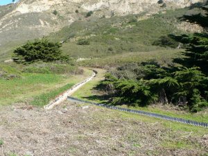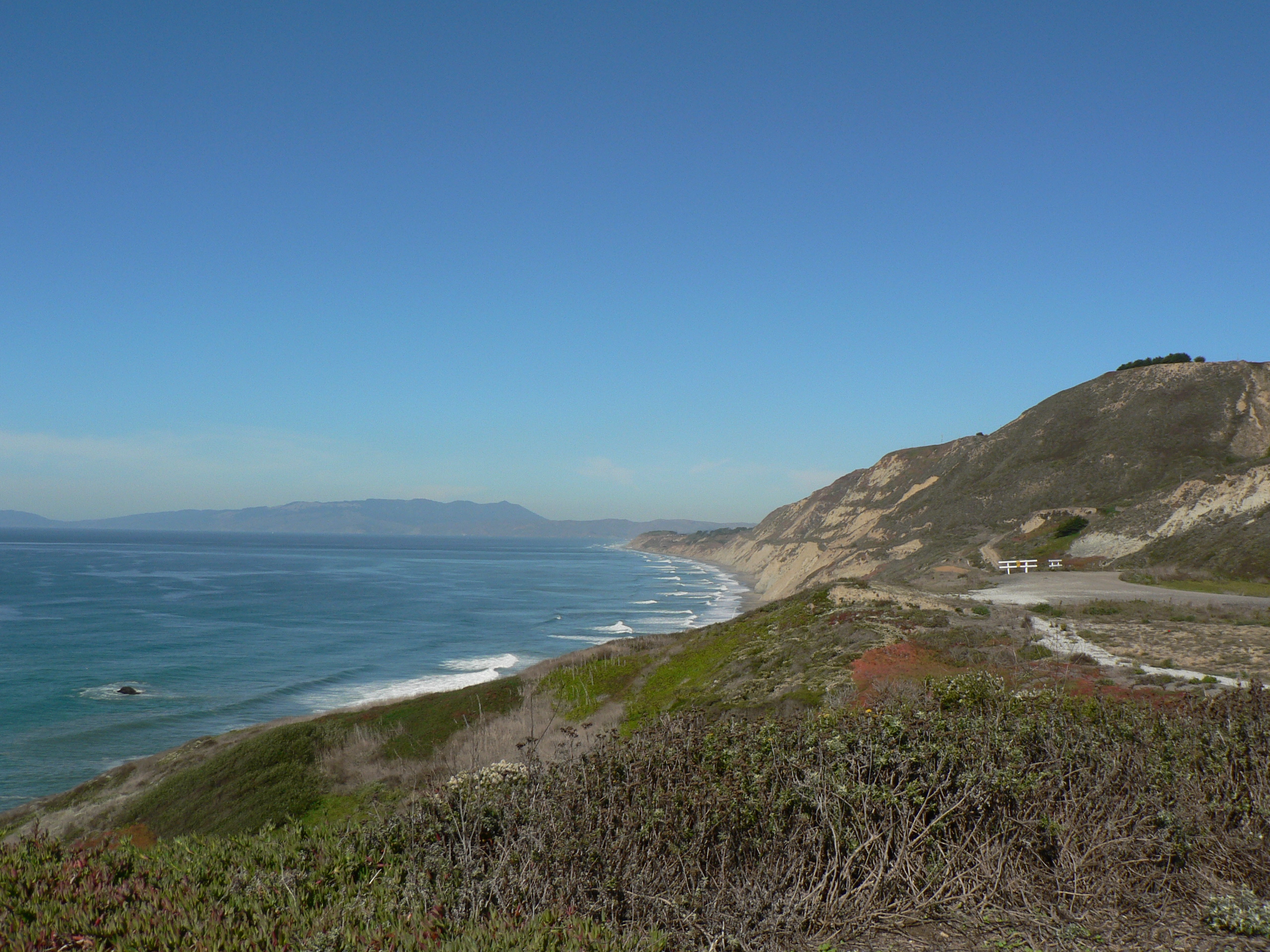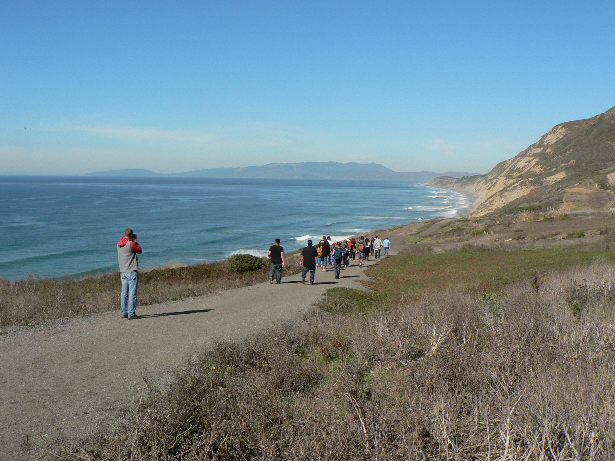 Descending through the landslide zone at Mussel Rock. The gap on the left of the dark hills on the horizon is where the San Andreas comes back ashore. Mt. Tam is on the right of the gap, Point Reyes is the left nub.