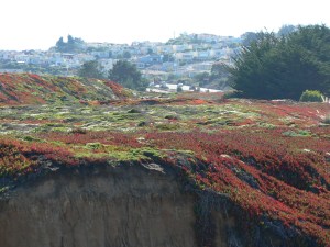 I leave you with a parting shot of a small front garden along Beach St. in Pacifica. The Persian Carpet iceplant (Drosanthemum floribundum) is a personal favorite of mine, being the groundcover of choice that we plant on Alcatraz for the pink flowers. To my eye the lonely sunken urn embedded in the center echoes hauntingly of the geologic forces at work in the area…