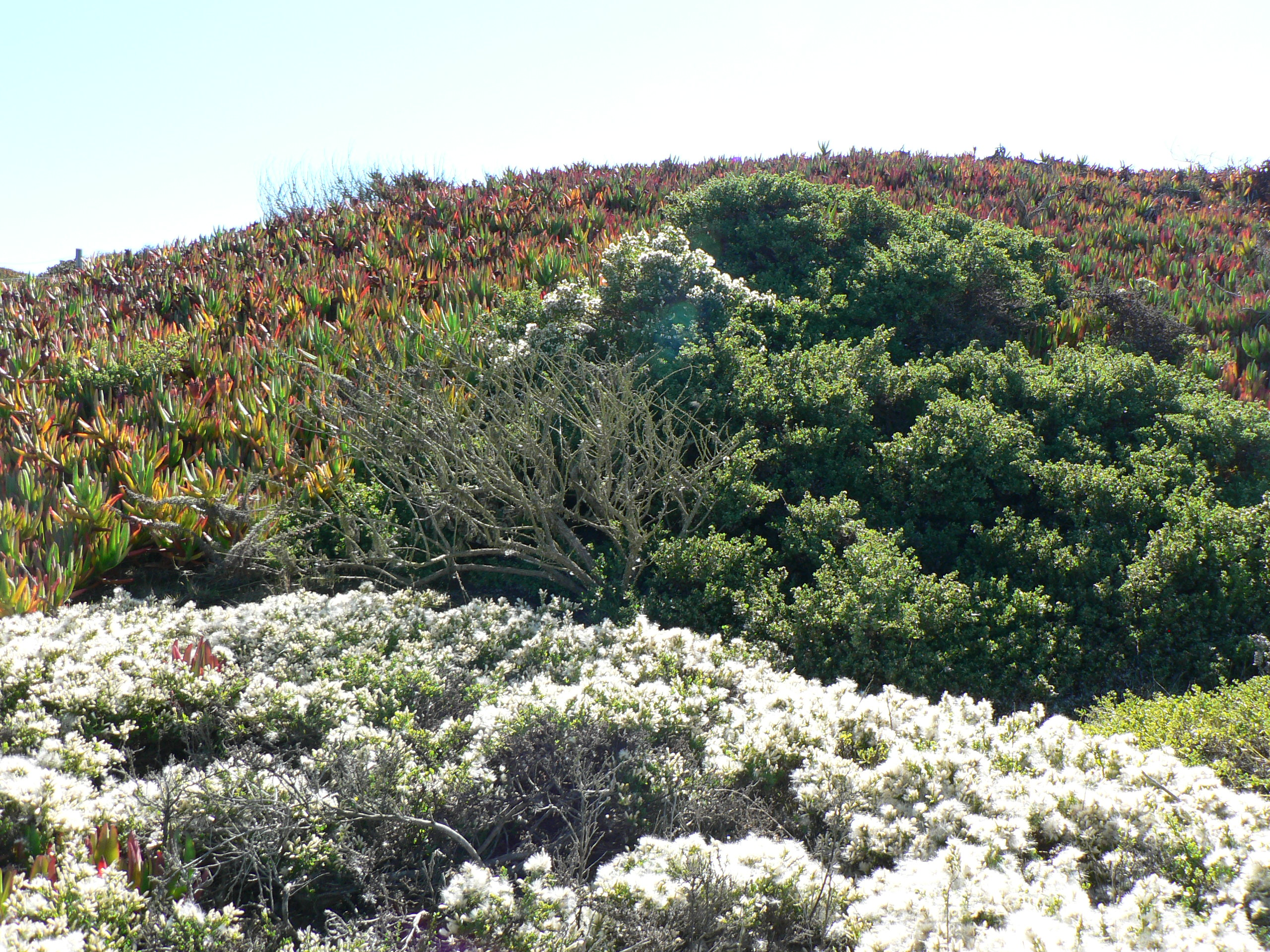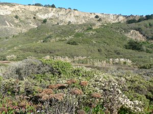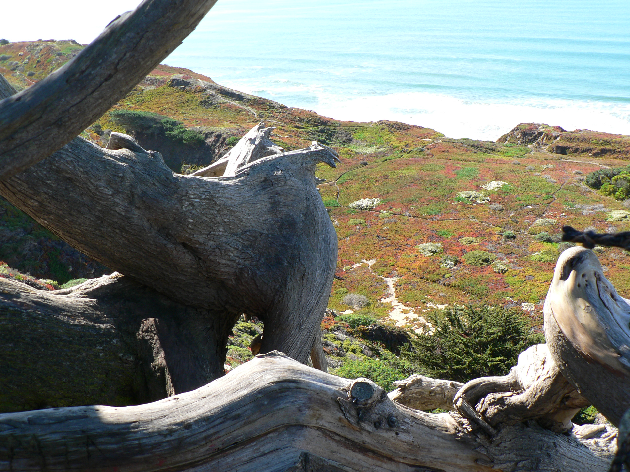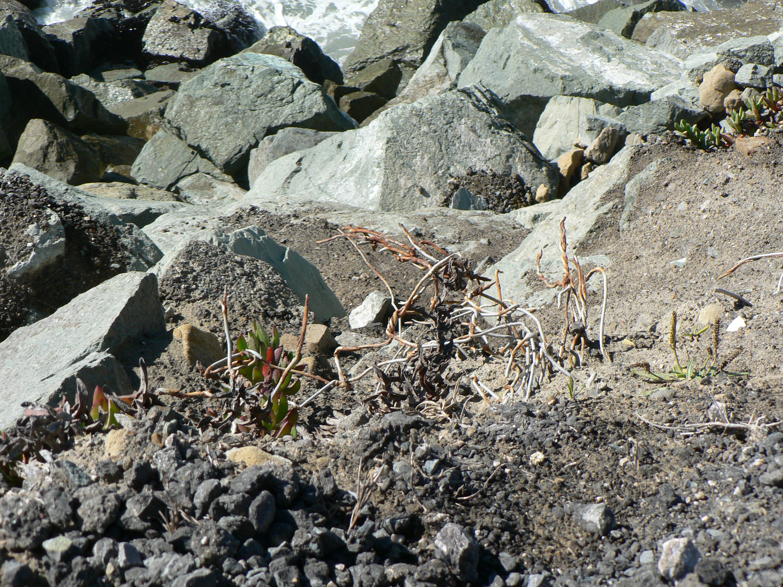 At Thornton Beach, we viewed cliffs and historic landslides from above. Damn, what a beautiful coastline! The prevailing plant is actually an invasive species – Highway Iceplant (Carpobrotus edulis) – that is a fast-growing succulent groundcover planted extensively to control erosion. Again with the irony, the plant has shallow roots and holds tons of water, and the weight actually increases the likelihood of landslides. Incidentally, as the edulis in its name reveals, it is edible. Leaves and fruits can be eaten (by us), and can be used to make a lovely tart jam. The plant’s fast growth and extreme size (50 foot diameter from a single root system) means it chokes out light for native seedlings and steals water from endemic species. Go harvest some and make some jam right now, and do your part to reduce its impact. 🙂