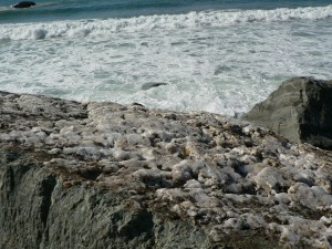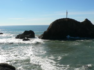 And there she is – Mussel Rock. I’m standing on the North American plate, looking across the submerged San Andreas Fault to the harder rock remnant on the Pacific plate.