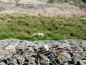Up-close with one of the culverts, topped by gabions. The gabions add weight to the slope, but filter debris to retain it and to keep it from clogging the culverts.