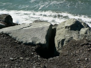 We’ve dammed all the rivers in California that bring sediment out to sea. Uh-oh. Where’s the sand supposed to come from to replace what is washing away southward? Good question. Our beaches have gotten narrower and narrower since settlement. Add to that the climate change and melting icecaps raising sea levels. Narrower beaches means the waves reach the cliffs more easily. That means the cliffs erode more readily and more frequently than before. During especially stormy El Niño years, we see some spectacular examples of erosion’s effects. Houses wash into the sea. Pacifica is particularly hard-hit, being nothing but a big seaside shelf of that loose sandstone. Even the past couple of winters we’ve seen yards and homes fall onto the beach, and houses have to be moved back from the cliffs. No coastal area is immune to this, but harder stone erodes much more slowly. In the 1990’s we even saw huge houses go over in the super-duper expensive Sea Cliff development in San Francisco, where people spend millions upon millions of dollars for the privilege of ocean views.