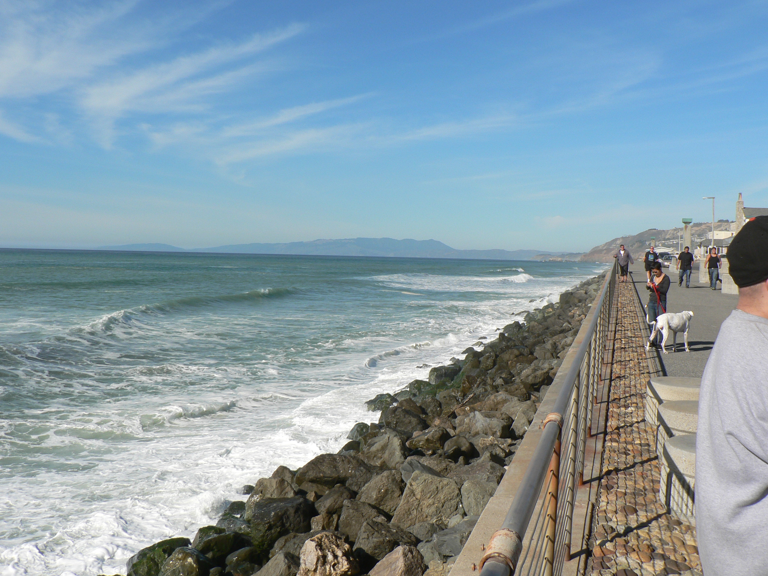 Looking north from Beach St. in Pacifica. Mt. Tam is getting smaller and smaller on the horizon as we move further south. (That white dog was SUCH a sweetie!)
