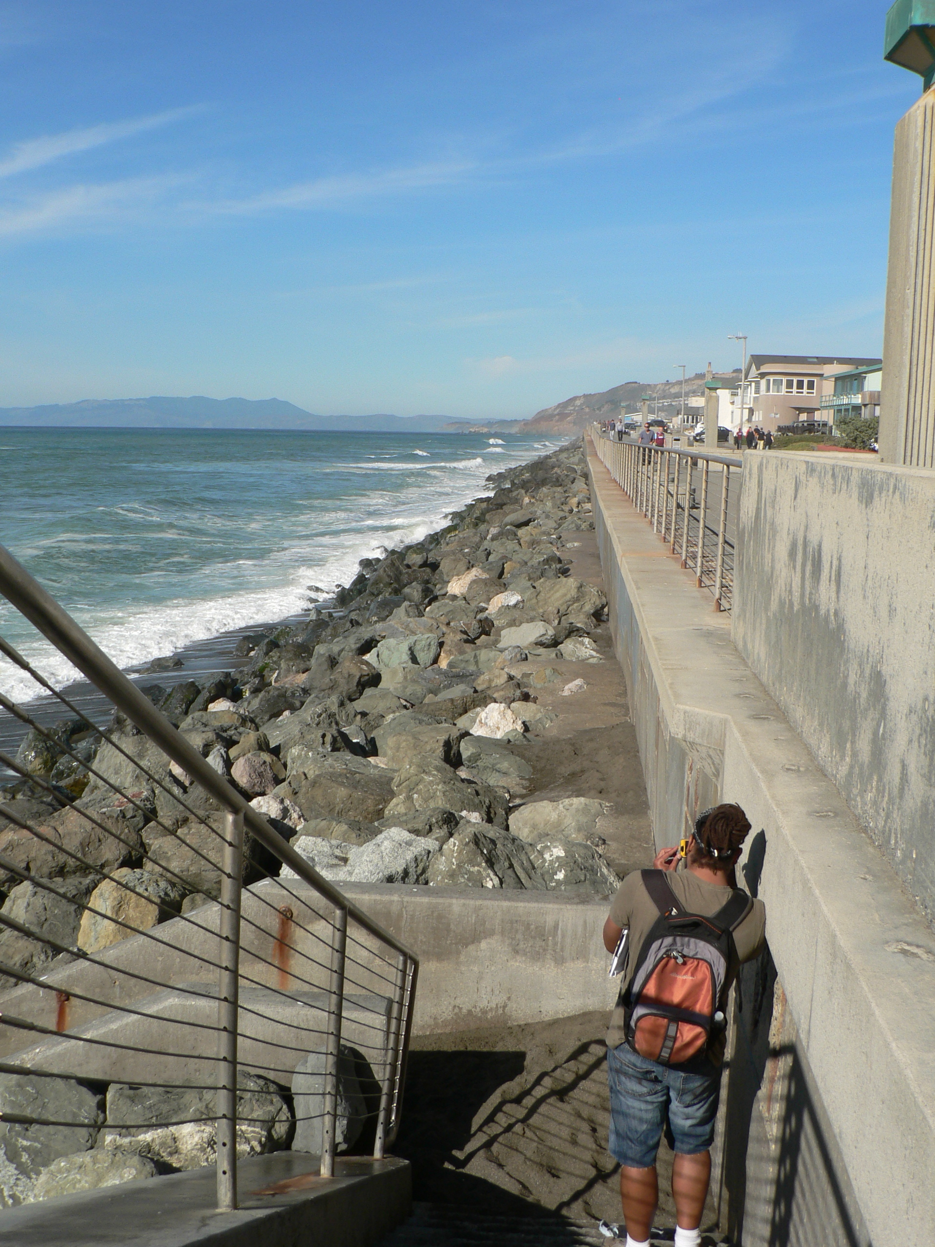 Our final destination was the town of Pacifica. Once a sleepy little fishing village of summer vacation homes, its proximity and easy access to SF (it’s faster to drive there from my work than to drive home) made it become a large and popular suburb of over 100,000 people. Pacifica is a popular spot for surfers. It’s also a popular spot to collapse into the sea, if you’re a sandstone cliff. Homes have been moved back from the edge many times over the decades. Even a couple of years ago we watched houses go over. The debate is on as to how to deal with that. Do we invest public funds to protect private property? There are strong arguments to both sides, but the reality is that it is a guaranteed losing battle. Or, at least a very very expensive one.