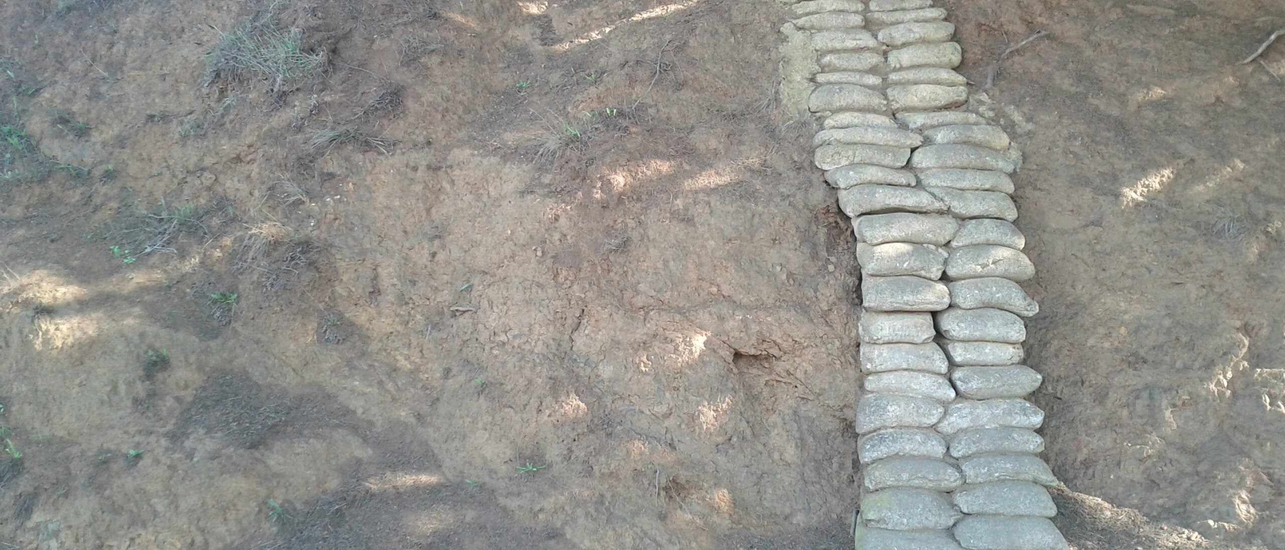 Concrete bags to prevent gully-cutting erosion along the climb.