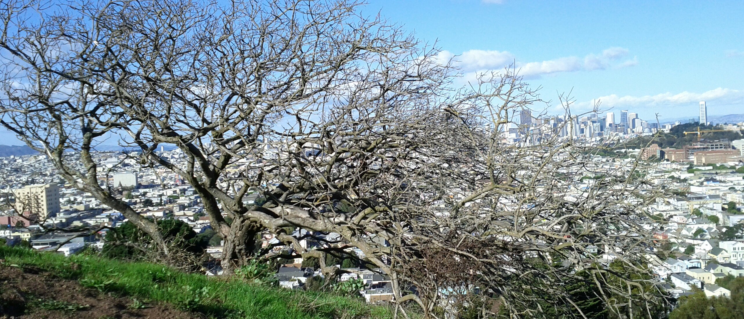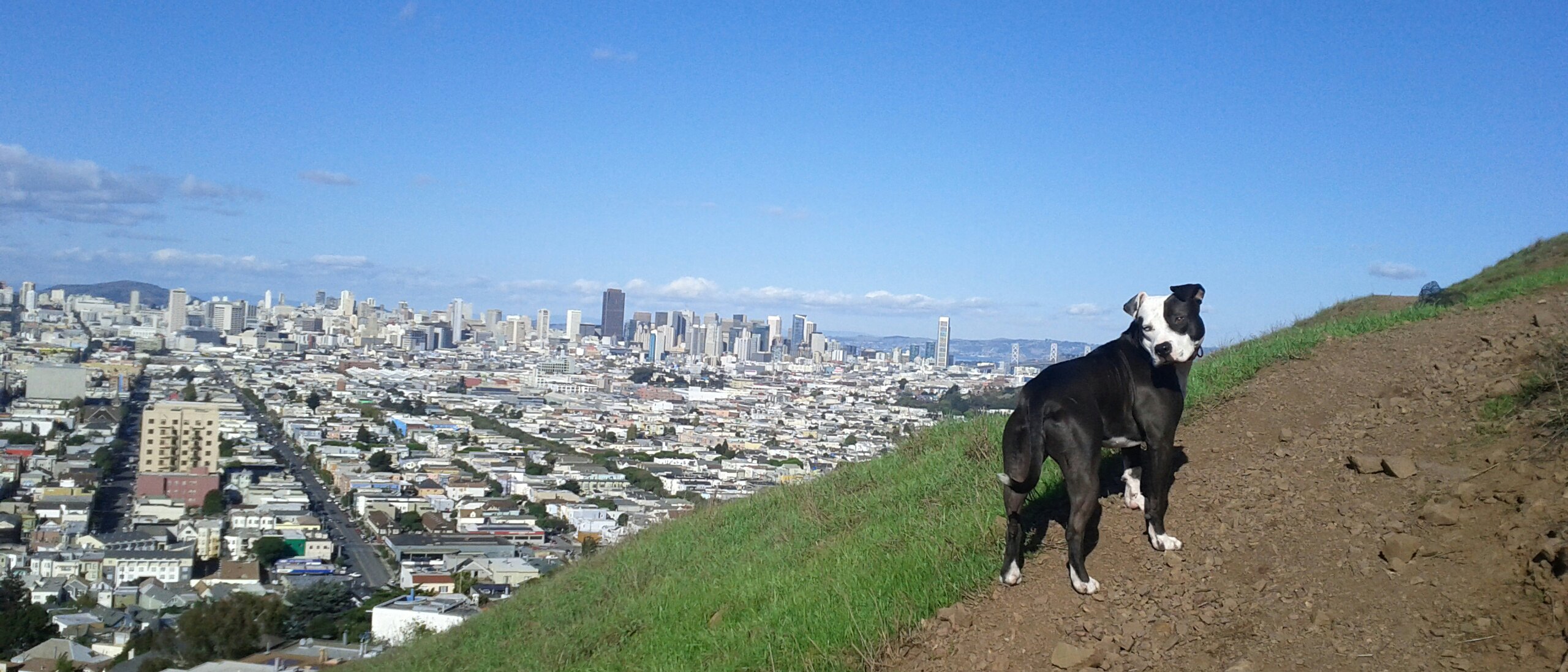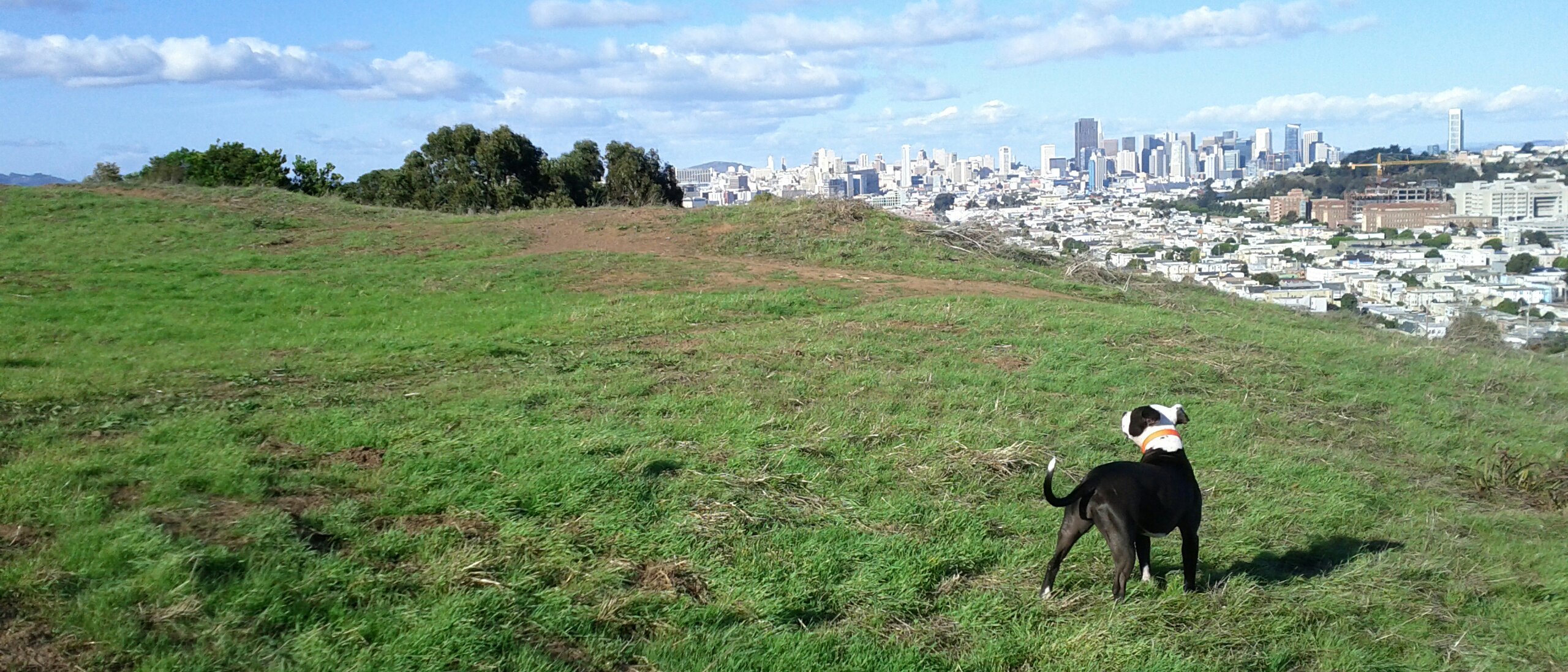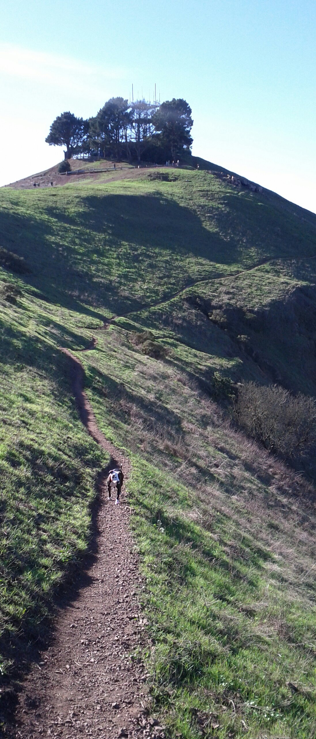 Yesterday was a gorgeous, clear, sunny day, despite being bitingly cold. (“Biting cold” in San Francisco is 55°F/13°C). In all the years I’ve lived here, I had never been to Bernal Heights Park! I’ve been around it, by way of the road circling it as a shortcut from traffic-clogged Cesar Chavez over to Cortland. I’ve been near it, by way of tending a friend’s community garden plot across the street from it. I’ve been past it, by way of my bus route to work every day. But I’ve never been in it. Yesterday I had access to a vee-hickle and decided to explore with our dog Spoon.