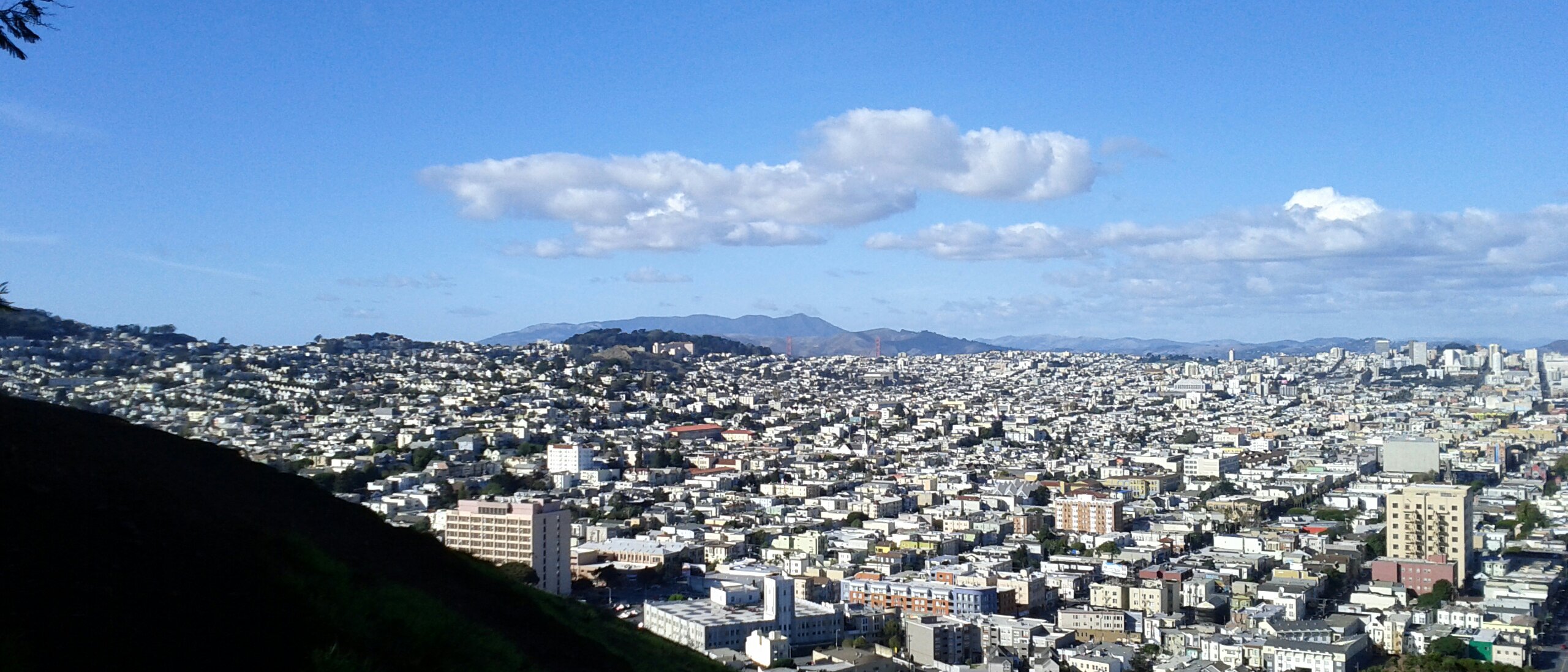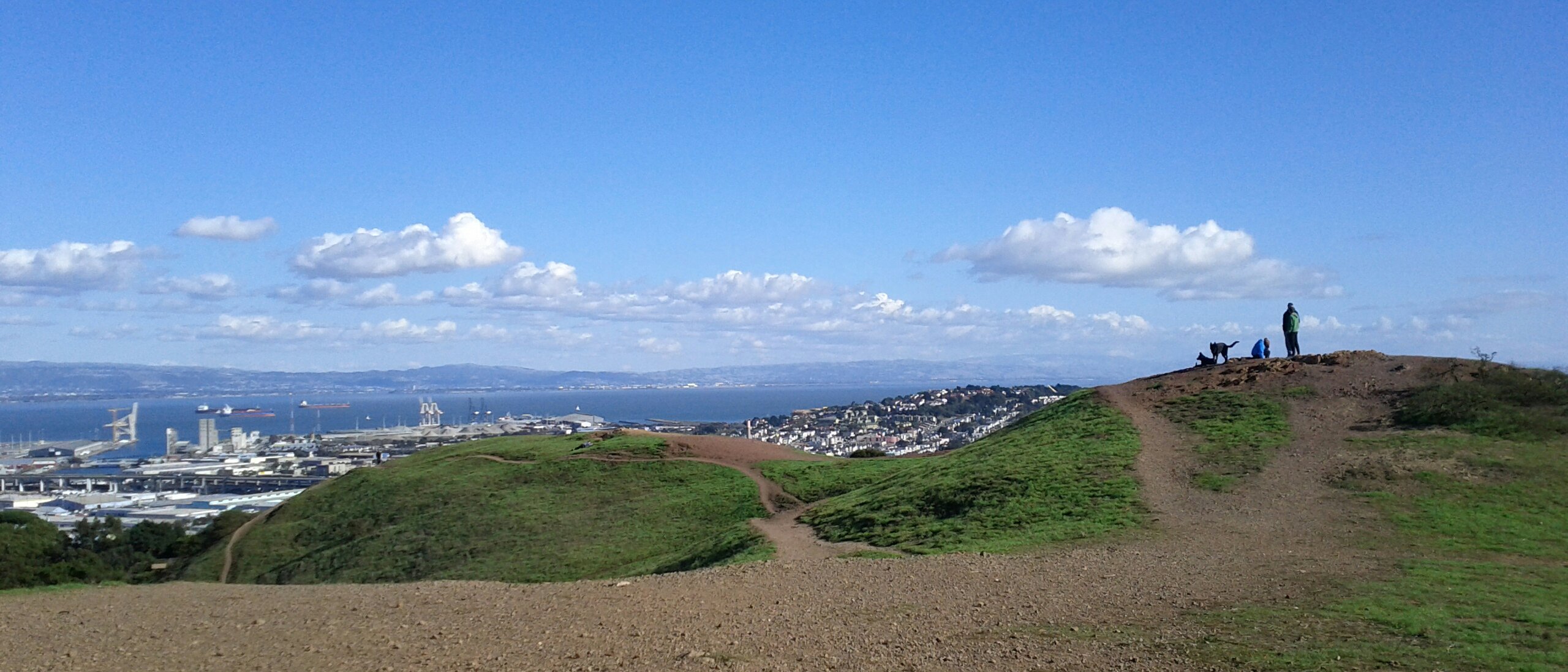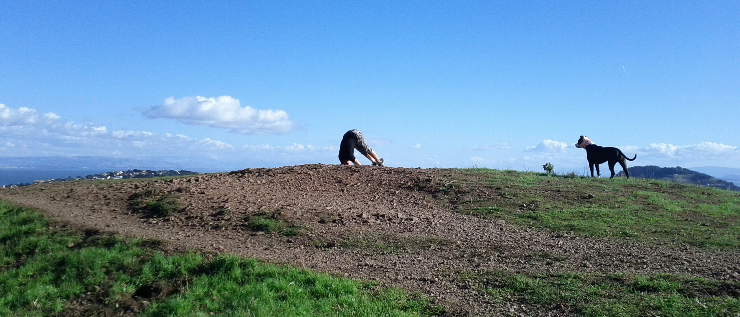 Yesterday was a gorgeous, clear, sunny day, despite being bitingly cold. (“Biting cold” in San Francisco is 55°F/13°C). In all the years I’ve lived here, I had never been to Bernal Heights Park! I’ve been around it, by way of the road circling it as a shortcut from traffic-clogged Cesar Chavez over to Cortland. I’ve been near it, by way of tending a friend’s community garden plot across the street from it. I’ve been past it, by way of my bus route to work every day. But I’ve never been in it. Yesterday I had access to a vee-hickle and decided to explore with our dog Spoon.