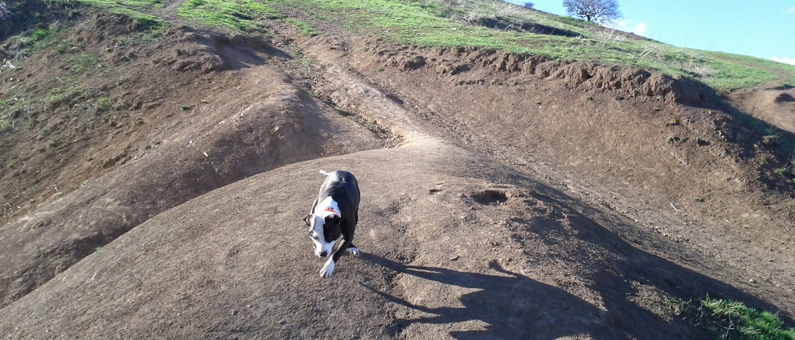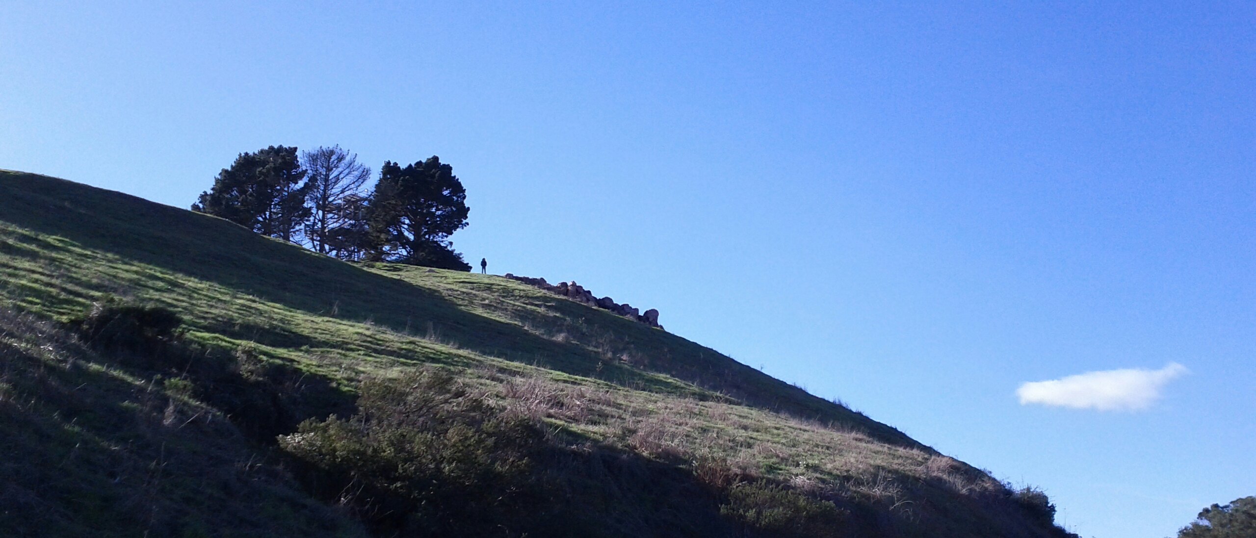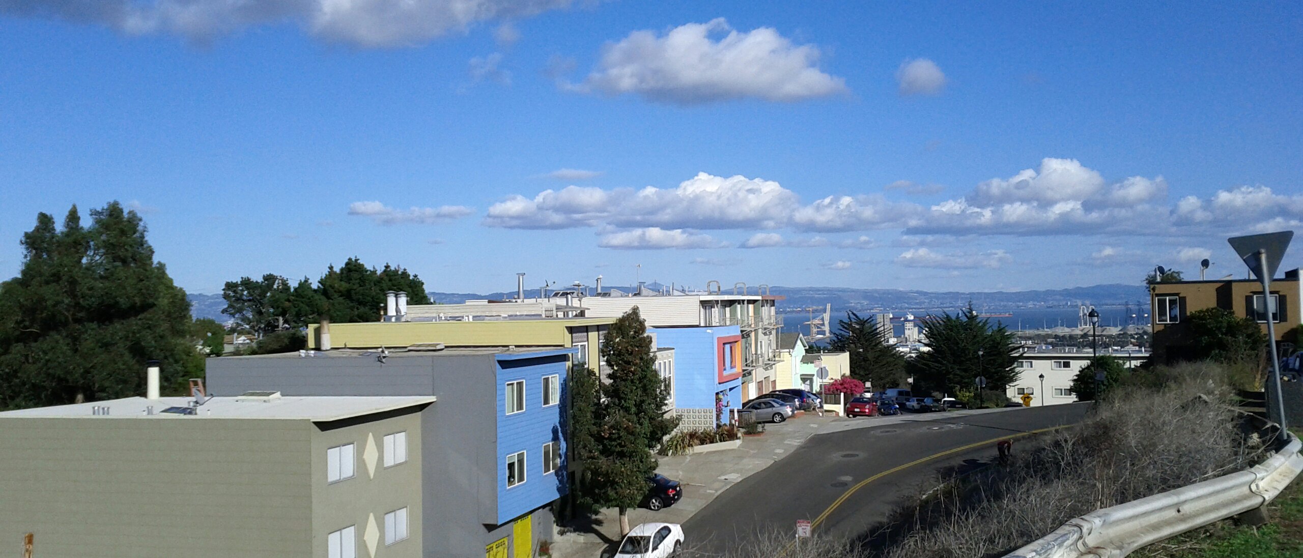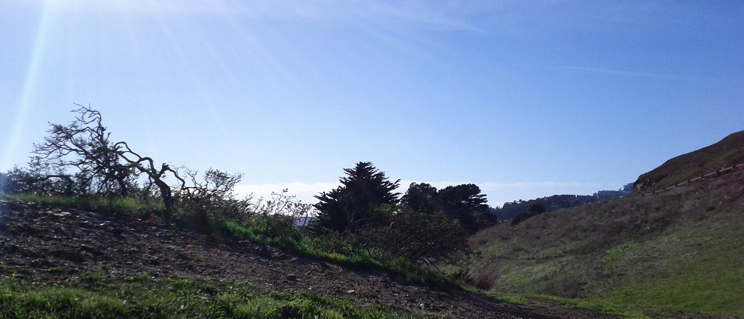 Yesterday was a gorgeous, clear, sunny day, despite being bitingly cold. (“Biting cold” in San Francisco is 55°F/13°C). In all the years I’ve lived here, I had never been to Bernal Heights Park! I’ve been around it, by way of the road circling it as a shortcut from traffic-clogged Cesar Chavez over to Cortland. I’ve been near it, by way of tending a friend’s community garden plot across the street from it. I’ve been past it, by way of my bus route to work every day. But I’ve never been in it. Yesterday I had access to a vee-hickle and decided to explore with our dog Spoon.