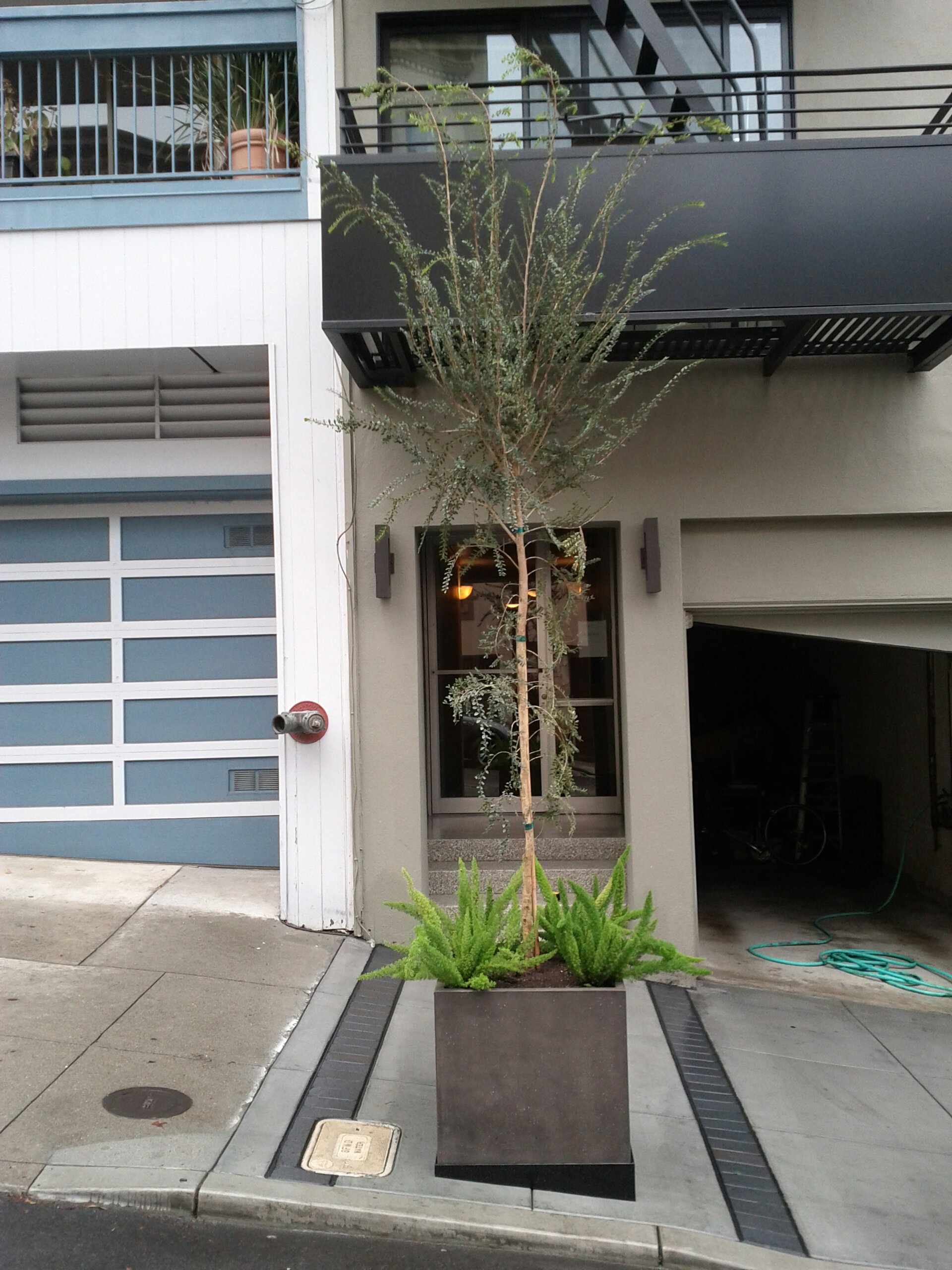 The planting was simple. Azara microphylla trees are favored for narrow spaces here in SF. They grow tall, up to 30′ in the ground, but can easily be kept to 4-6′ wide. Some foxtail ferns (Asparagus densiflorus ‘Myers’) for each corner added some zing to the planting. I chose to use the store’s Planting Mix for the soil. Regulare Potting Soil would stay too consistently damp for this northern-exposure slope of Russian Hill, and the Cactus Mix we sell drains well but would require him to water a bit more frequently than he’ll be able to keep up with easily. Planting Mix was the happy medium (pun intended).