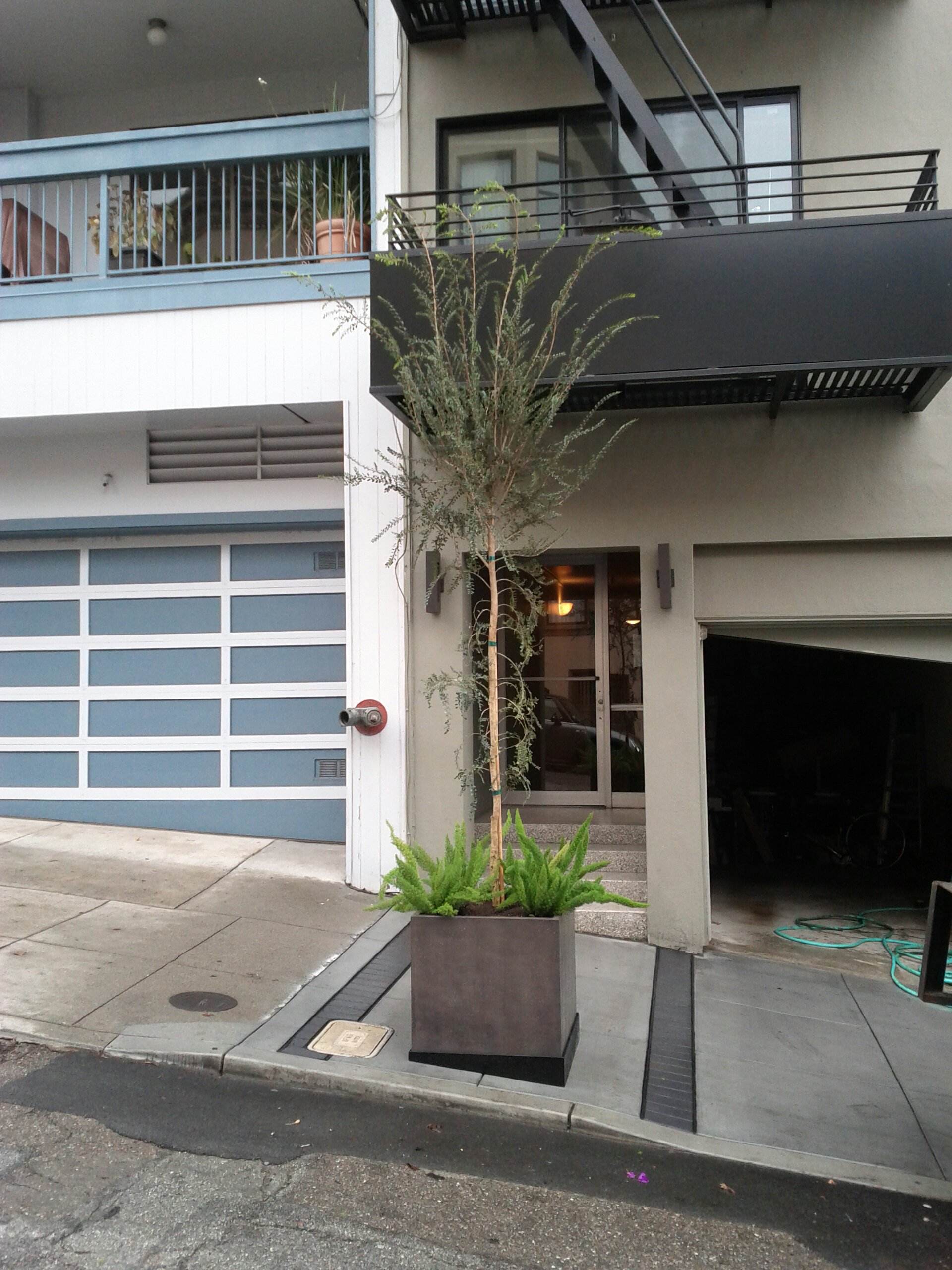 The customer had gotten permits for a street garden while renovating the building, but the narrow space couldn’t be dug out because of the house plumbing going right through it. Any planting would have to be in a container. No prob! The colors of his house went perfectly with this pottery we sell called Fibreclay. Fibreclay is a lightweight fiberglass-reinforced clay line of pottery and troughs that are favored for their clean, modern lines,  and are light weight enough for easy carrying and using on roofs and balconies.