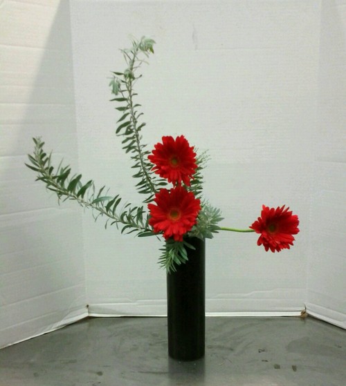 Basic Upright Nageire, again for midterm. Gerber daisies provided a “punch” with silvery green Acacia covenyi.
