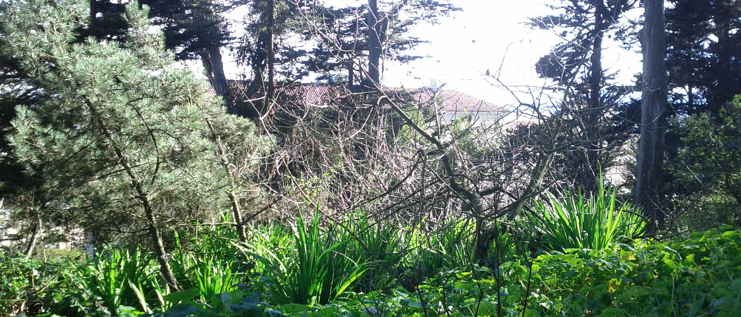 Vivid greens glow underneath the bare trunks of deciduous trees.