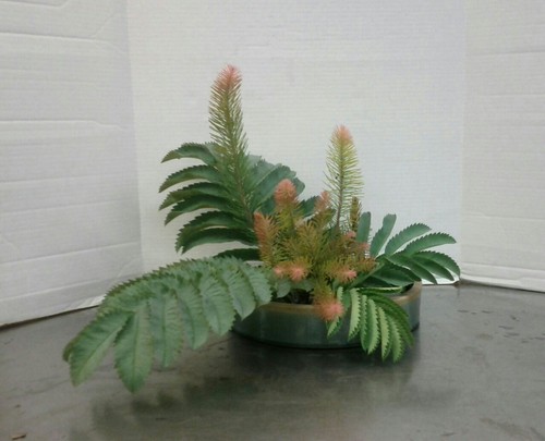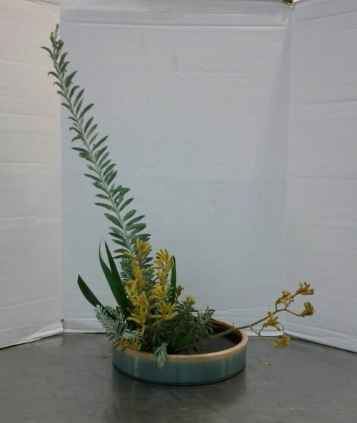My Upright Moribana Variation #4 used leaves and flowers from a yellow kangaroo paw with the branch of an acacia.