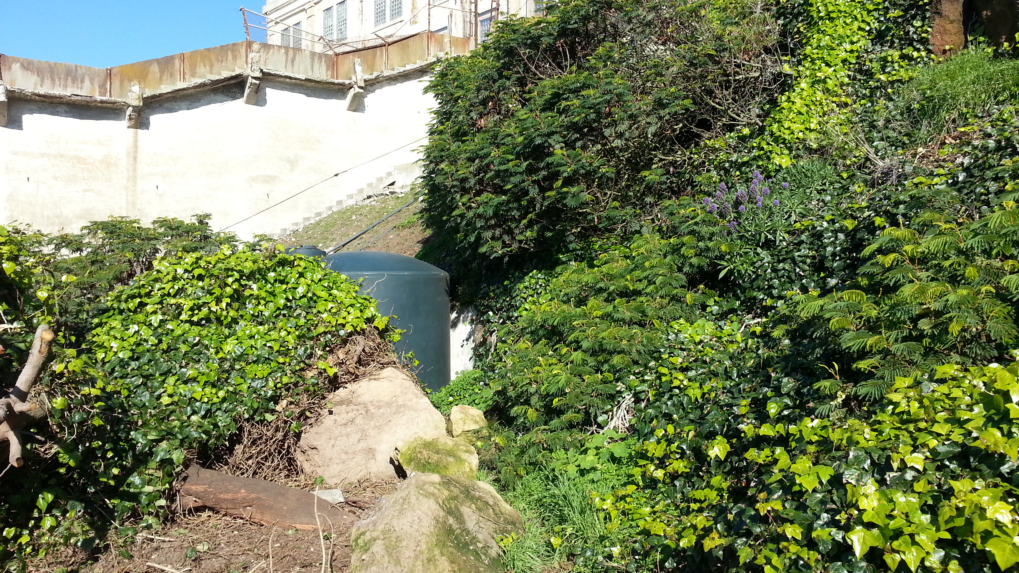 Rocks seeing light for the first time, now that the overgrowth is being cleared. The tanks catch water from the Cellhouse roof, and store thousands of gallons for use in the gardens.