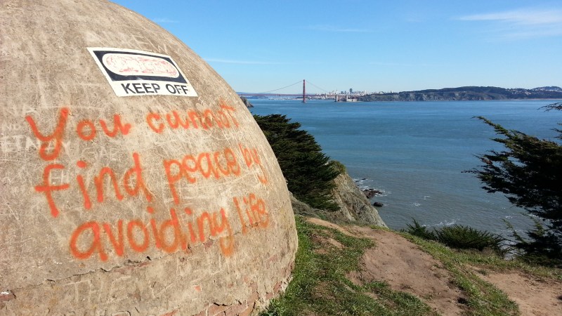 You cannot find peace by avoiding life. Nice graffito on the turret!