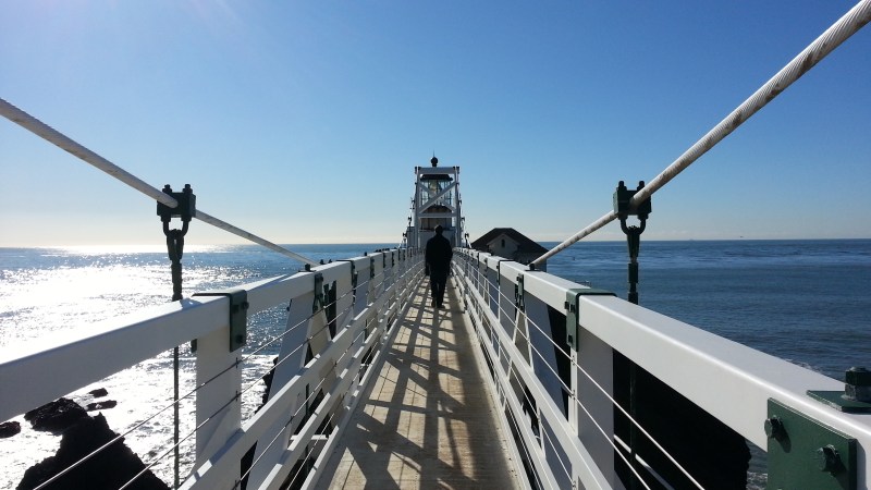 The last stretch of the path is a wooden suspension bridge that sways and bounces as you cross. Ack.