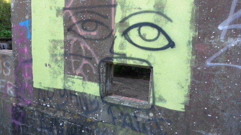 On the outside wall of the structure.